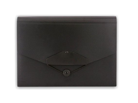 Zamykana na gumkę. Zawiera 12 przegródek dostosowanych do dokumentów formatu A4 oraz przekładki indeksujące.