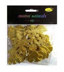 Zestaw elementów w formie aniołów z pianki brokatowej wielkości 40 mm , zawierający ok. 50 elementów, pakowany w eleganckie opakowanie z eurozawieszką. Elementy można naklejać na każdą powierzchnię lub używać do innych zdobień. Opakowanie zawiera elementy w kolorze złotym.