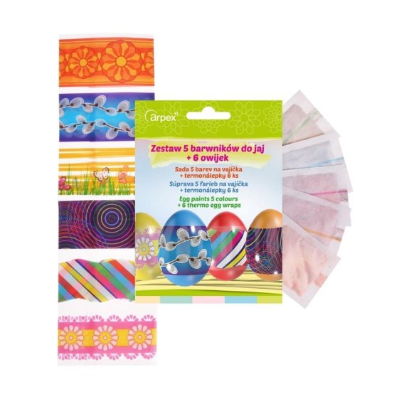 Zestaw do dekoracji pisanek. W zestawie barwniki w 5 kolorach oraz owijki na jajka w różnych wzorach. Kolory barwników: żółty, pomarańczowy, czerwony, zielony, niebieski. Sposób użycia produktu znajduje się na opakowaniu. Barwniki są przeznaczone wyłącznie do barwienia jaj. Wymiar opakowania: 10x8 cm.