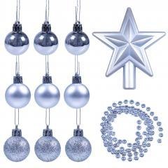 Zestaw dekoracji choinkowych w pudełku. W skład zestawu wchodzi: - gwiazda na czubek choinki - łańcuch z kuleczek - bombki brokatowe x3 - bombki matowe x3 - bombki błyszczące x3 Zestaw w kolorze srebrnym. Opakowanie o wymiarach 9 x 22,5 cm.