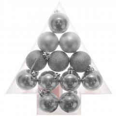 Zestaw bombek w świątecznym opakowaniu w kształcie choinki. Opakowanie transparentne umożliwiające zapoznanie się z produktem bez wyjmowania z pudełka. Zestaw zawiera trzy rodzaje bombek gładkie, matowe oraz brokatowe. 12 sztuk w opakowaniu. Bombki o średnicy 4 cm.