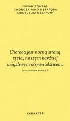 Dwa słynne eseje, które weszły do kanonu humanistyki. Analizując źródła naukowe i utwory literackie od antyku po czasy współczesne (odwołując się choćby do Homera, Baudelaire'a, Manna, Joyce'a czy Audena) Susan Sontag rekonstruuje mitologię gruźlicy i choroby nowotworowej. Pokazuje przy tym sposoby, w jakie społeczeństwo stygmatyzuje chorych i demistyfikuje ideologiczne fantazmaty, które zmierzają do demonizacji niektórych chorób. Drugi esej, napisany pod koniec lat 80., jest pionierską analizą AIDS i społecznych wyobrażeń, jakie towarzyszyły pojawieniu się tej choroby.