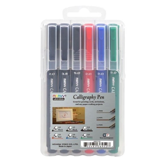 Kolorowe, trzy różne grubości - 2,0 mm, 3,5 mm i 5,0 mm, długopisy kaligraficzne "Marvy Calligraphy" są idealne do kreatywnej pracy na papierze, gdy potrzebna jest czcionka artystyczna (na pocztówki, pozdrowienia, zaproszenia, wizytówki itp.). Atrament na bazie wody, nie zawiera kwasów, nietoksyczny. Końcówki - typ kuty. Nadaje się zarówno dla profesjonalistów, jak i amatorów.