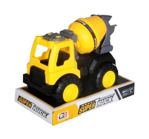 Plastikowa ciężarówka betoniarka dla dzieci. Zabawka zapakowana w kartonową podstawkę z przezroczystym kloszem. Produkt dla dzieci od 3 lat. Podane wymiary są wymiarami opakowania.