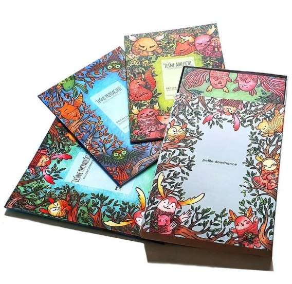 Zestaw kolorowanek złożony z czterech tomów z serii Leśne opowieści zapakowanych w ozdobne pudełko (tom 1 "Leśne opowieści", tom 2 "Leśni przyjaciele", tom 3 "Leśne maluchy", tom 4 "Leśne gry"). Wszystkie ilustracje powstały ręcznie, z najwyższą dbałością o szczegóły. Ich indywidualny styl sprawia, że jest to produkt wyjątkowy i niepowtarzalny. Cała seria została wydrukowana w Polsce, na papierze o gramaturze 200 g posiadającym certyfikat ekologiczny FSC. Kartki sklejone są tak, aby łatwo było je rozłożyć i w razie potrzeby - wyrwać. Pokolorowany obrazek stanie się wtedy ozdobą ściany lub spersonalizowanym prezentem dla najbliższych. Kolorowanki Petite dominance to gwarancja wspaniałej, rozwijającą zabawy, która wciągnie na długie chwile i podbije serca dzieci i dorosłych!