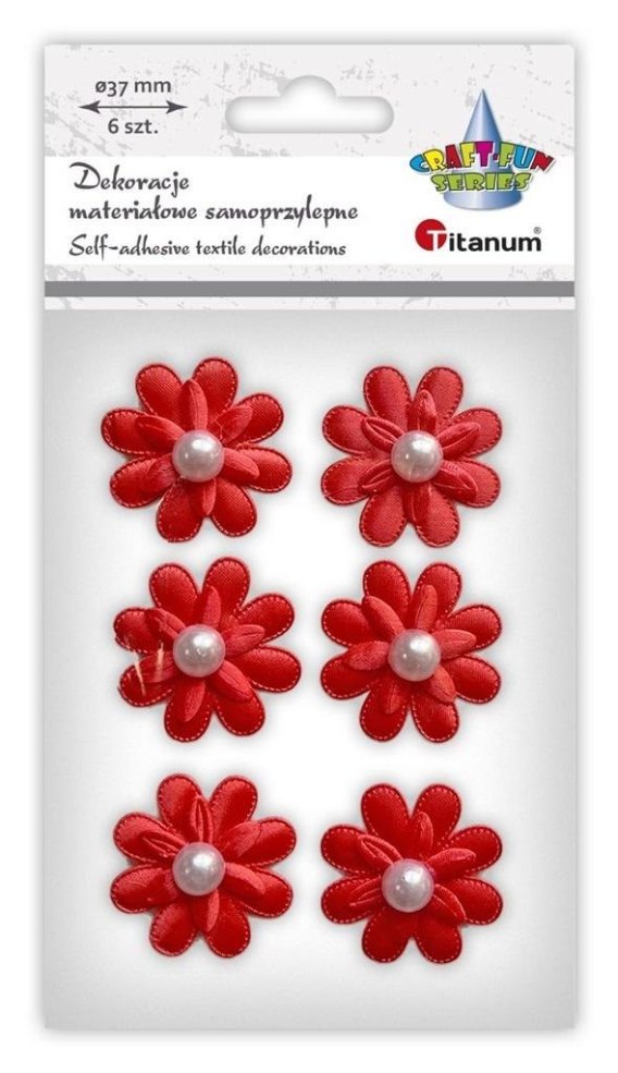 Dekoracje samoprzylepne materiałowe 3D kwiaty O37mm czerwone z perełką 6szt.