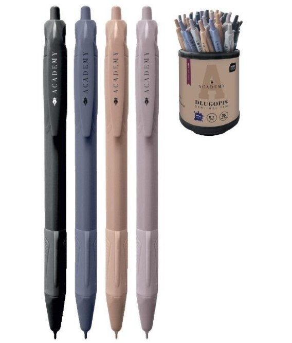 Wygodny gumowy uchwyt. Niebieski wkład żelowo-olejowy. Grubość linii pisania: 0.7 mm. 4 kolory / 36 szt. w kubiku.