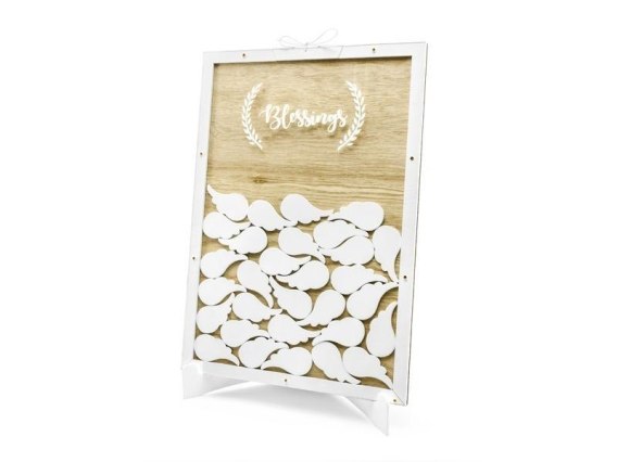 Drewniana księga gości z białym napisem Blessings, zestaw zawiera prostokątną księgę w oraz 30 białych skrzydełek do wypisania, wymiary ok. 27,5 x 39,5 cm.