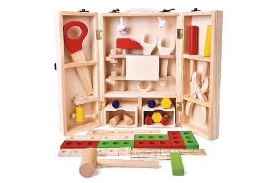 Drewniana skrzynia z narzędziami. Funkcje: skrzynka się zamyka, elementy łączą się poprzez otwory i śrubki.