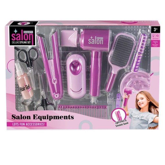 Zestaw składa się z suszarki z dwoma wymiennymi końcówkami i prostownicy na baterie, szczotki, grzebienia, 2 wałków, 2 spinek, 2 par nożyczek oraz plastikowej buteleczki. Prostownica posiada blokadę, wymaga użycia baterii - 2xAAA (niedołączone). Suszarka na baterie - 3xAAA (niedołączone).