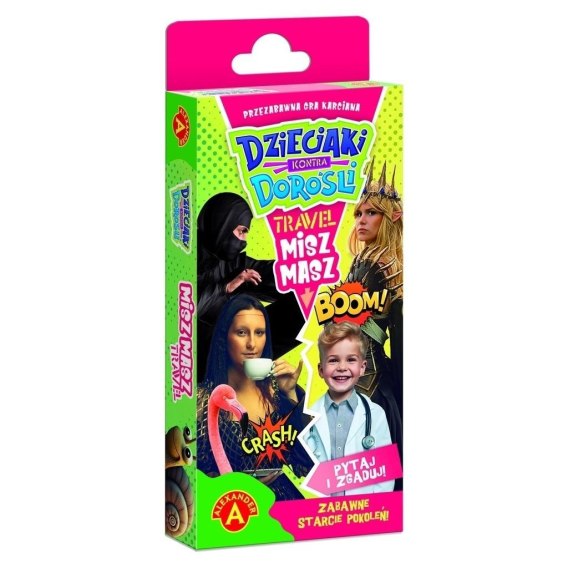 "Dzieciaki Kontra Dorośli Misz Masz Travel" to gra planszowa, która zapewni świetną zabawę całej rodzinie. Dzieci rywalizują z dorosłymi, odpowiadając na podchwytliwe pytania. Dzięki dwóm oddzielnym zestawom kart z pytaniami o innym poziomie trudności dedykowanym dzieciom oraz rodzicom, szanse na wygraną są takie same dla obu drużyn.