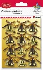 Dzwoneczki plastikowe O25mm wysokość 26mm z doklejoną rypsową kokardą i mocowaniem twist złote 12szt.