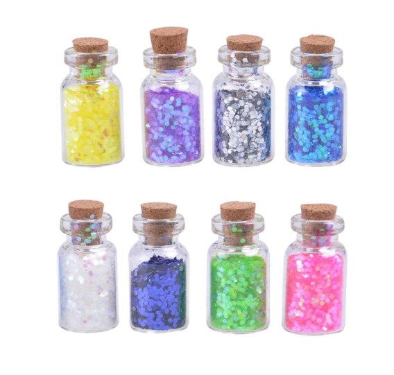 Ozdoby mix kolorów i kształtów w buteleczkach, każda zawiera 2 g materiału.
