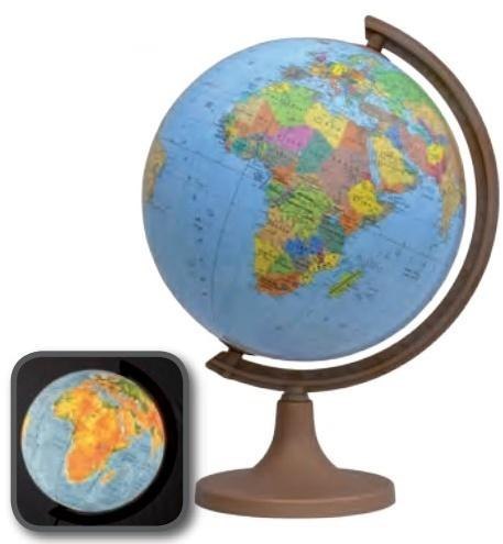Globus 320 mm podświetlany, mapa polityczno-fizyczna 2w1, plastikowa niska stopka, cięciwa plastikowa. Jest to globus zawierający mapę polityczną Świata, natomiast po podświetleniu pojawia się mapa fizyczna. Więc na jednym globusie mamy 2 mapy. Świetnie nadaje się do przyswajania geograficznego położenia nie tylko państw, ale także możemy znaleźć szczyty gór, niziny, wyżyny itp.