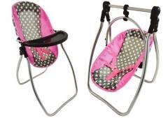 Huśtawka dla Lalek Krzesełko do Karmienia Alice Gwiazdki Szaro-Różowa Opieka nad lalkami przebieranie, karmienie to coś, w co każda mała dziewczynka lubi się bawić. Huśtawka z krzesełkiem do karmienia to jedna z rzeczy, które na pewno urozmaicą zabawę, stanie się ciekawsza i doda realizmu. Krzesełko posiada stabilne nogi wykonane z aluminium. Zabawka ma dwa zastosowania jako huśtawka i krzesełko do karmienia. Szary materiał w białe gwiazdki ma po boku różowe paski. Łączenia wykonane są z plastiku w kolorze czarnym. Cechy takie jak opiekuńczość, troskliwość to tylko niektóre z cech, które będą rozwijać się u dziecka. Nauczy się także jak opiekować się małym bobasem. Aby zmienić huśtawkę na krzesełko wystarczy ściągnąć górny drążek, odpowiednio dopasować siodełko na stelaż i dołożyć stolik. Wymiary huśtawki: 36 cm x 42 cm x 47 cm Wymiary krzesełka: 36 cm x 42 cm x 57 cm Wymiar opakowania: 51 cm x 36,5 cm x 6,5 cm Posiada certyfikat CE, ponadto jest zgodny z normą EN71. Przeznaczony dla dzieci powyżej 3 roku życia.