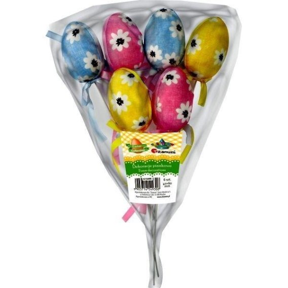 Jajka styropianowe 40x60mm z dekoracją materiałową w kwiaty i wstążką na piku ok. 19cm 3 kolory 6szt.