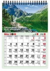 Kalendarz 2026 Biurkowy A5 MIESIĘCZNY PIONOWY. Oprawa spirala na grubej podstawie kartonowej. Format 145/210mm. Papier kredowy. 12 strony (układ miesięczny ) + okładka. Kalendarz zawiera imieniny, nazwy świąt, numeracje tygodni, znaki zodiaku, wschody i zachody słońca. Zdjęcia pięknych widoków górskich