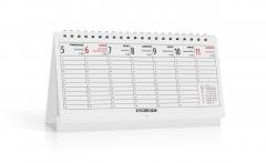 "Kalendarz biurkowy typu namiot, kalendarium w układzie miesięcznym, 54 strony + okładka. Na spirali, papier w środku kreda mat. Wymiary 250x110 mm"