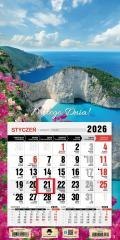 Kalendarz 2026 Trójdzielny JEDNODZIELNY MINI Z MAGNESEM. Format 230/460mm. Układ kalendariów jednodzielny z przesuwnym okienkiem. Główka z otworem wierconym oraz magnesem to doskonała propozycja do przyczepienia na lodówkę. Dodatkowo nazwy miesiąca i dni tygodnia w języku Ukraińskim, Angielskim i Niemieckim. Kalendarium dodatkowo zawiera fazy księżyca i znaki zodiaku. Dużo miejsca do notowania, czytelne duże litery i cyfry.