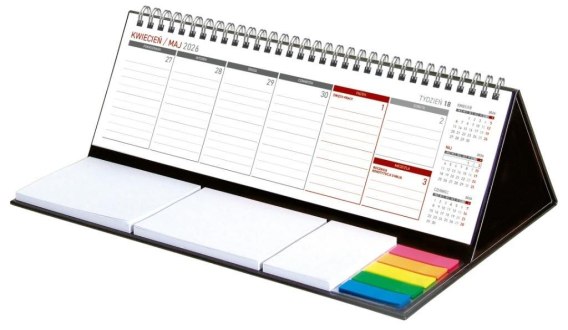 Wygodny kalendarz stojący na biurko z przejrzystym kalendarium w układzie tygodniowym z miejscem do notowania. Poręczne samoprzylepne karteczki. Kalendarium na spirali.