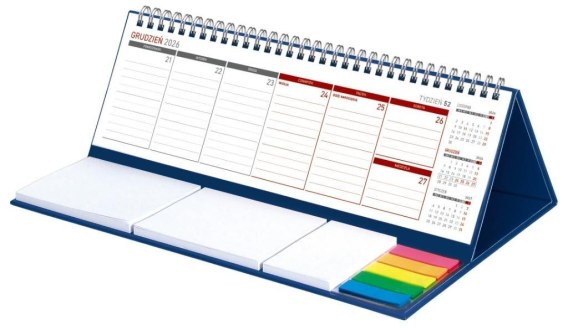 Wygodny kalendarz stojący na biurko z przejrzystym kalendarium w układzie tygodniowym z miejscem do notowania. Poręczne samoprzylepne karteczki. Kalendarium na spirali.