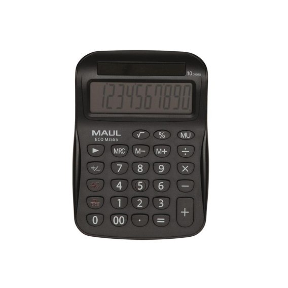 Biurkowy kalkulator MAUL ECO MJ555 w kolorze czarnym z dużym, 10-pozycyjnym wyświetlaczem LCD. Niezawodny, stylowy i dokładny. Doskonały do szkoły i w terenie. Kompaktowy rozmiar i zaokrąglone krawędzie sprawiają, że dobrze leży w dłoni. Z łatwymi do czyszczenia przyciskami. Zasilany energią słoneczną - brak potrzeby wymiany baterii. Wyposażony w 3 przyciski pamięci, obliczanie pierwiastków kwadratowych i procentów. Obudowa wykonana jest w 60% z recyklingowego plastiku. Gwarancja: 5 lat. Ekologiczne opakowanie z papieru i tektury, bez użycia plastiku - można je poddać recyklingowi. Certyfikowany Blue Angel.