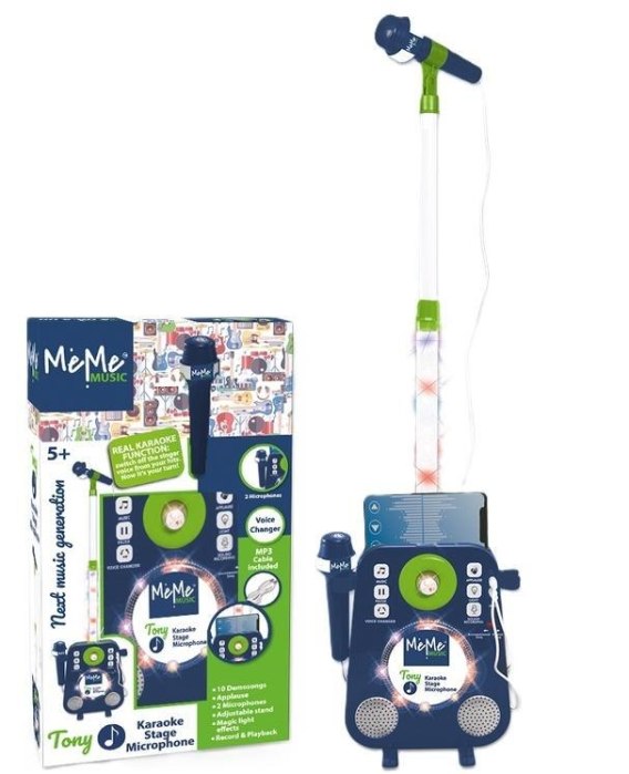 Sprzęt do karaoke. Instrument posiada głośnik oraz 2 mikrofony. Możliwość regulacji statywu oraz włączenia efektów świetlnych. 10 piosenek demo, dźwięk aplauzu oraz tłumu. Możliwość nagrywania i odtwarzania głosu. Podłączenie do mp3 za sprawą dołączonego kabla. Baterie nie są częścią zestawu.