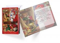 Kartka wielkości B6, zdobiona w zależności od wzoru metaliczną folią lub brokatem. Każda kartka posiada kolorowe życzenia w środku i koperte.