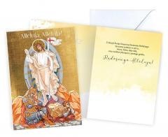 Kartka wielkości B6, zdobiona w zależności od wzoru metaliczną folią lub brokatem. Każda kartka posiada kolorowe życzenia w środku i dopasowaną kopertę w komplecie.