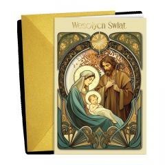 Kartka z życzeniami z dopasowaną kolorystycznie kopertą. Ozdobę stanowią konfetti i złocenie. Całość zabezpieczona folią typu"open".