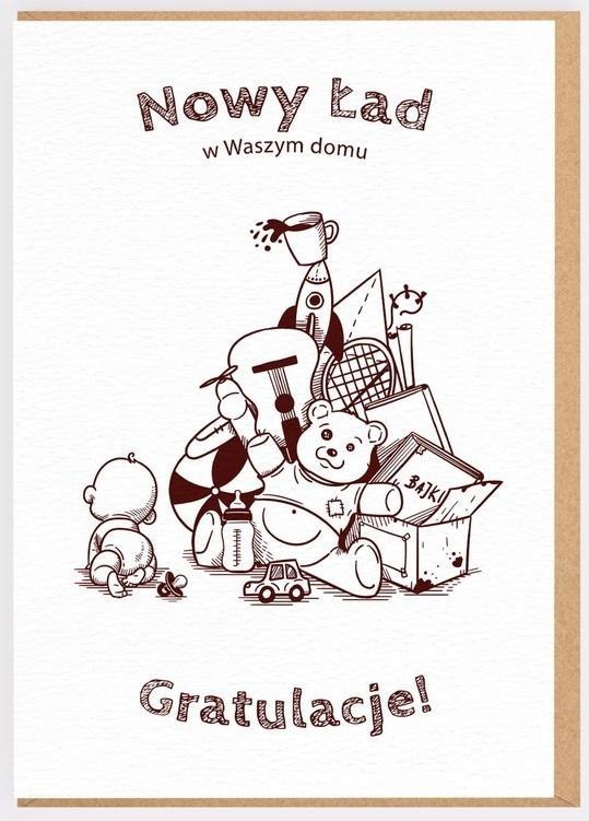 Kartka okolicznościowa NOWY ŁAD poleca się z okazji narodzin dziecka jako dodatek do prezentu dla młodych rodziców. Kartka w zestawie z elegancką kopertą jest pusta w środku i została wydrukowana na papierze ekologicznym. Jej wnętrze czeka na wypełnienie treścią płynącą prosto z Twojego serca!