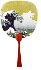 Elegancki japoński karnet premium z piękną, artystyczną ilustracją. Przedstawia tradycyjny japoński wachlarz (uchiwa) o delikatnym, zaokrąglonym kształcie, na którym umieszczono jedną z najbardziej ikonicznych scen japońskiego drzeworytu. Na powierzchni wachlarza dominuje potężna, dynamiczna fala z cyklu Wielka fala pod Kanagawą Katsushiki Hokusai . W tle, pod złotym niebem z delikatnymi deszczowymi smugami, widoczna jest majestatyczna, ośnieżona góra Fuji. Wachlarz ma subtelny, złocisty górny fragment, a całość została starannie odtworzona z dbałością o oryginalną fakturę i kolorystykę ukiyo-e. Uchwyt wachlarza jest wykonany z głębokiego, ciepłego czerwonego drewna o widocznym usłojeniu. Karnet w zestawie z pasującą kopertą, bez tekstu w środku.