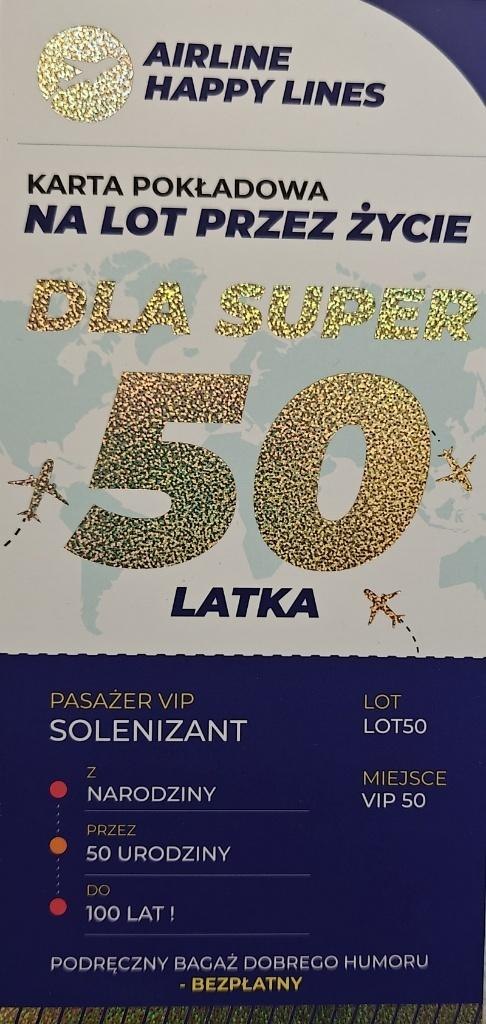 Karnet SE. Karnet na 50 Urodziny w formie karty pokładowej na lot przez życie. Uszlachetniony wysokiej jakości złoceniem holograficznym. Karnet zawiera zabawne życzenia.