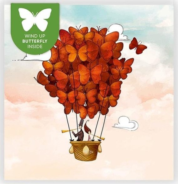 Karnet w formacie kwadratu (15x15cm) z niespodzianką. Po otwarciu karnetu wylatuje z niego papierowy motylek. Wspaniała niespodzianka dla osób poszukujących oryginalnego i efektownego prezentu. Do karnetu dołączona jest instrukcja obsługi. Wyprodukowany na Litwie.