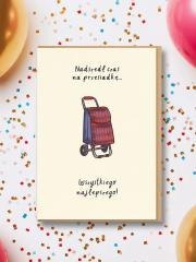Czas na przesiadkę - z hulajnogi na wózek zakupowy! Kartka CZAS NA PRZESIADKĘ z lekkim humorem mówi o tym, że dojrzewanie (czytaj: starzenie się) to proces nieunikniony, ale można przeżyć go z klasą i uśmiechem.