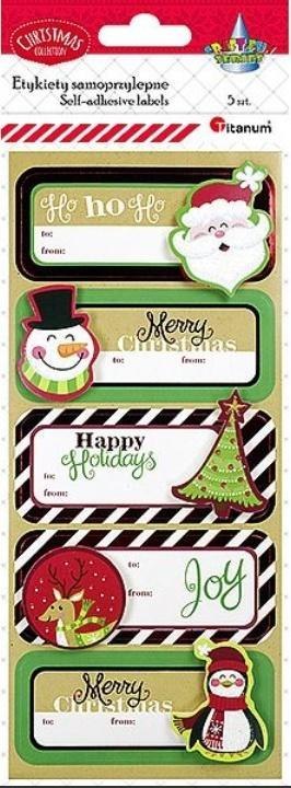 Samoprzylepne karnety prezentowe. Wykończone papierowym dekorem na piance 3D. Wymiary etykiety: 90x38mm. Kolekcja bożonarodzeniowa. 5 etykiet.