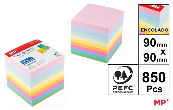 Kostka z kolorowego papieru do szybkich notatek. Gumowane z jednej strony, aby zapobiec ich luzowaniu. Papier 70 g/m2. Wymiary arkusza: 90 x 90mm. Blok 850 arkuszy w kolorach fluorescencyjnych i pastelowych.