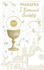 Karnet komunijny, złocony i tłoczony, naklejane elementy, tekst życzeń w środku.