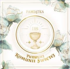 Karnet komunijny, złocony i tłoczony, tekst życzeń w środku.