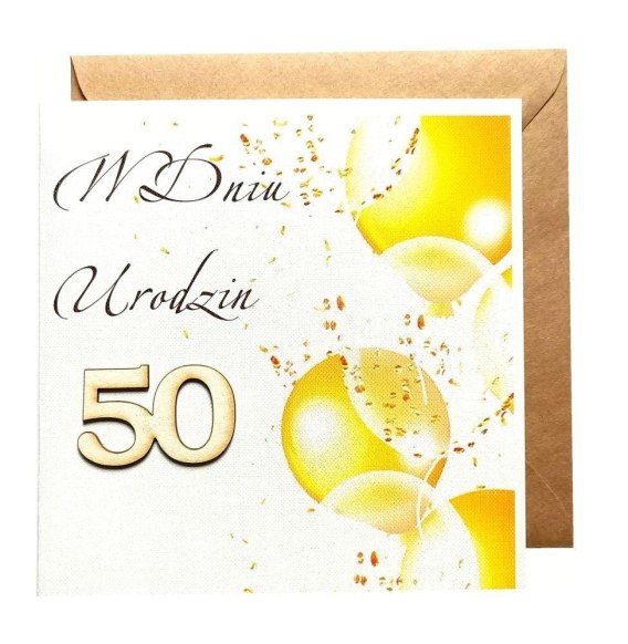 Kartka okolicznościowa z okazji urodzin o treści: Pół wieku już na świecie spędziłeś, I wiele szaleństw w tym czasie przeżyłeś. Pamiętaj, w życiu nie ma czego żałować, A urodziny trzeba hucznie świętować, I tak też dzisiaj zaraz zrobimy, Wzniesiemy toast, życzenia złożymy. Niech uśmiech na Twojej twarzy zagości, Bo dom Twój pełen będzie dziś gości!