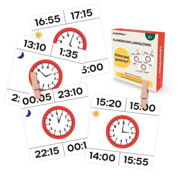 Zestaw zawiera 22 kolorowe karty z zegarami - na każdej karcie znajdują się 4 godziny, a tylko jedna z nich jest prawidłowa.