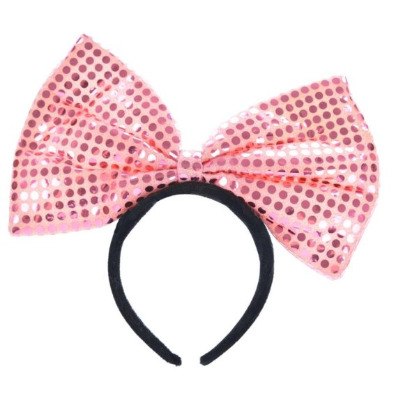 Cekinowa kokarda gigant na opasce Idealne dopełnienie stroju na imprezę urodzinową, wieczór panieński lub zabawę karnawałową. Rozmiar kokardy: 26 - 30 cm Kolor: różowy
