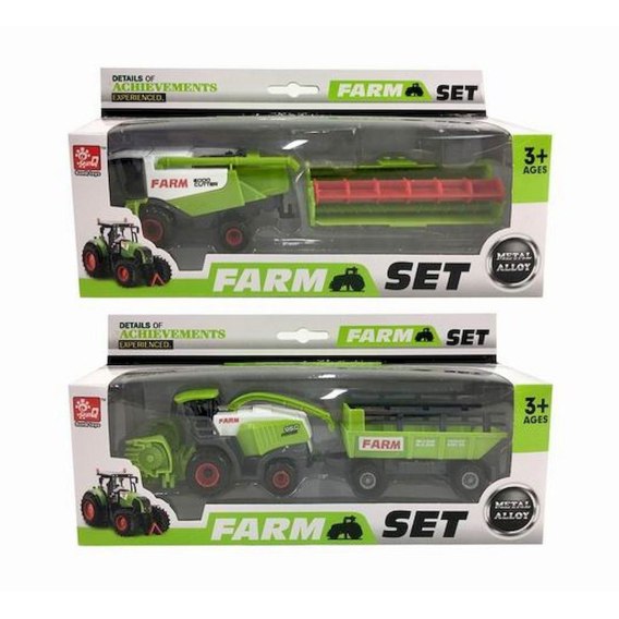 KOMBAJN Z PRZYCZEPĄ Zestaw zawiera kombajn z elementami metalowego nadwozia, oraz dodatkowym urządzeniem rolniczym.