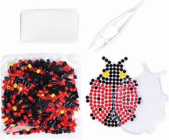 Opakowanie zawiera koraliki do zaprasowywania, z których można wykonać dwa motywy na dołączonej podkładce. Zestaw zawiera również pęsetę, papier do zaprasowywania oraz instrukcję.
