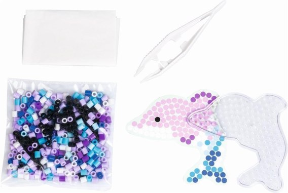 Opakowanie zawiera koraliki do zaprasowywania, z których można wykonać dwa motywy na dołączonej podkładce. Zestaw zawiera również pęsetę, papier do zaprasowywania oraz instrukcję.