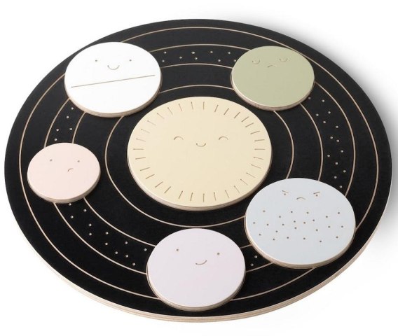 Multifunkcyjny sorter czyli okrąg, który posiada wycięte wgłębienia. Zadaniem dziecka jest dopasowanie 6 planet w odpowiednie otworki, to ćwiczenie uczy logicznego myślenia, koordynacji wzrokowo-ruchowej. Dodatkowo każda planeta posiada inny kolor oraz mimikę.