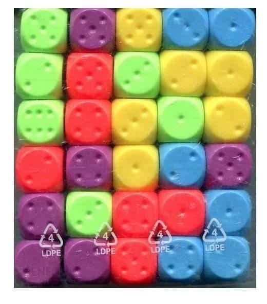 Komplet klasycznych, wielokolorowych kostek idealny do wielu gier a także dziecięcych zabaw.