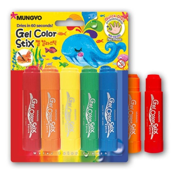 wysuwanego z obudowy za pomocą pokrętła. W zestawie 5 żywych kolorów, które się super gładko nakładają .Szybko wysychają w ciągu 60 sekund nie tworząc zabrudzeń w otoczeniu. Przy rozprowadzaniu pędzelkiem przy użyciu wody uzyskuje się efekt malowaia farbami akwarelowymi. Sztyfty mogą być złączone w bloki co ułatwia przechowywanie. Posiadają certyfikat bezpieczeństwa ASTM D4236 i zgodności z normą CE.