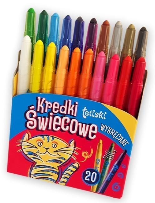 Kredki świecowe wykręcane. Okrągły kształt. Łatwo rozprowadzają się po powierzchni. Nie wymagają dużego nacisku podczas pisania. Opakowanie: pudełko 20 kolorów