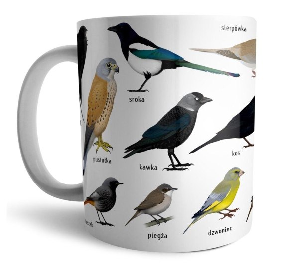 Na kubku znajdziesz wizerunek jerzyka i i innych ptaków często żyjących w mieście: pustułki, sroki, kawki, kosa, sierpówki, grzywacza, bogatki, gołębia, pliszki siwej, szpaka, oknówki, modraszki, wróbla, mazurka, dzwońca, piegży, kopciuszka.
